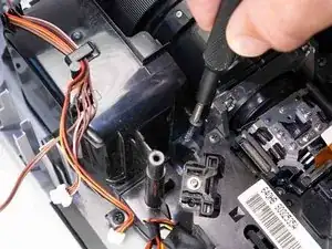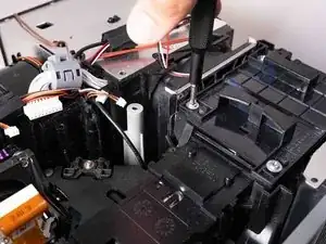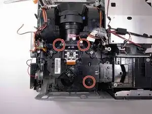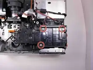 Используйте отвертку Phillips №2, чтобы удалить три чёрных винта 14 мм, удерживающих корпус проектора.
