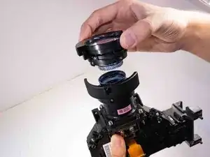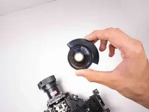 Поверните передний оптический элемент против часовой стрелки и снимите его с корпуса проектора.