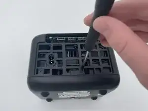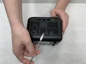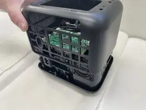 Есть три винта Phillips, крепящих корпус. Два находятся внутри отверстия, оставленного на предыдущем шаге, а третий расположен на нижней стороне проектора. Удалите все три.