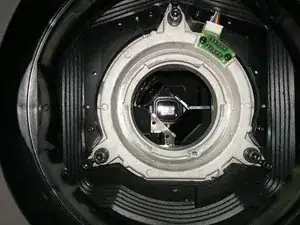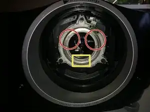 На этом изображении показан вид внутрь отсека для объектива. Обычно здесь закрывается шторка, защищающая оптические элементы, но в этом проекторе она была удалена.