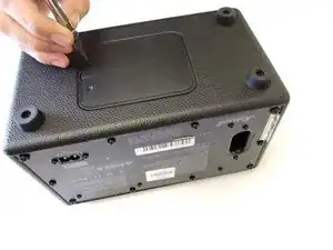 Установите динамик в вертикальное положение и отверните вручную или гаечным ключом золотой болт вокруг выключателя питания.