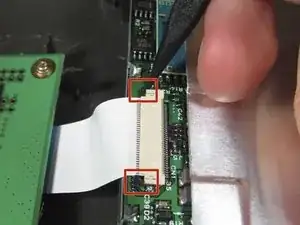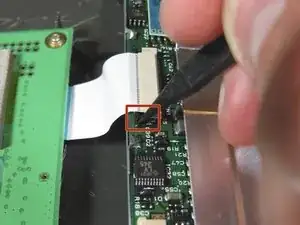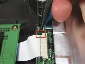 Используйте лопаточку, чтобы отсоединить ленточный кабель от дисплея, отжав чёрные фиксаторы от разъёма. По одному фиксатору с каждой стороны разъёма.