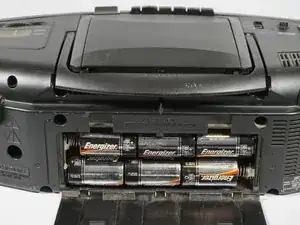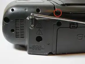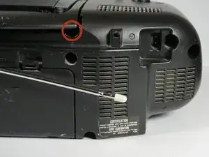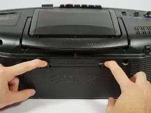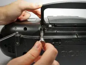 Держите ручку бумбокса под углом, чтобы получить доступ к винтам за CD-плеером.