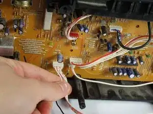 Отсоедините две соединительные колодки, удерживающие переднюю панель на бумбоксе.