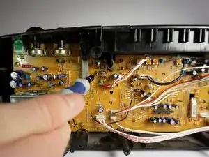 Используйте пинцет, чтобы поддеть и снять кнопки громкости и тюнера, расположенные в верхнем левом углу бумбокса.