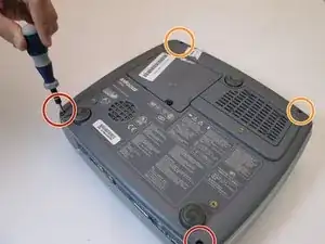 Поднимите пять металлических язычков, расположенных в задней части проектора.