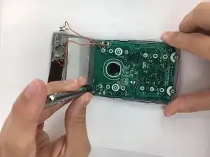 Пластиковой лопаткой аккуратно подденьте контакты батарейки с передней панели. Если пластиковая лопатка слишком слабая для поддевания контактов, используйте маленькую металлическую лопатку. Осторожно подгибая и/или поддевая маленькие зубчики контактов вверх, вы легко их снимете.