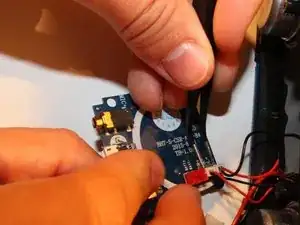 Используя пинцет, нажмите на предохранительные защёлки пластикового переключателя, затем отсоедините вручную разъём кабеля питания (красный средний по размеру).