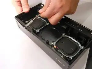 Используя одновременно пластиковый инструмент для вскрытия и металлическую лопатку, аккуратно подденьте крышку сверху динамика.