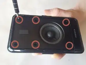 Теперь возьмите отвертку J0 JIS, чтобы удалить семь 5-мм винтов на пластиковом корпусе динамика.