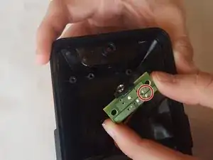 Для дальнейшего разборки динамика также есть два 5-мм винта на зеленой печатной плате, которые крепят динамик к печатной плате. Открутите их отверткой J0 JIS.