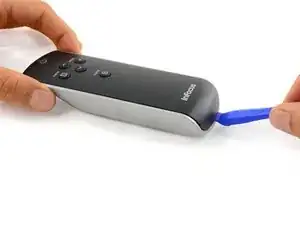 Вставьте пластиковый инструмент для открытия в щель между черной верхней крышкой и серебряной основой в нижней части пульта.