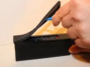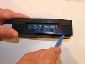 На решётке в углах, ближе к кнопке питания, находятся четыре защёлки. Используйте пластиковую лопатку, чтобы освободить все четыре защёлки от панели, затем проведите лопаткой вдоль кромки решётки, чтобы её было легко сдвинуть и снять.