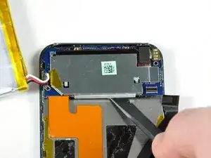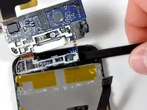 Плату петли антенны нужно оторвать (она приклеена). Аккуратно используйте пластиковый инструмент для открывания или лопатку, чтобы освободить плату петли антенны. Плата соединена с электроникой антенны тонким ленточным кабелем. Эта двухплатная сборка очень хрупкая.