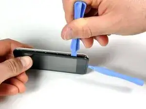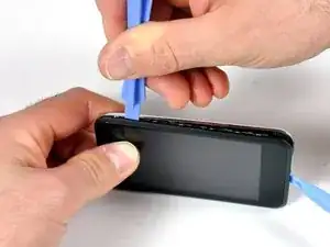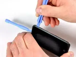 Вставьте маленький пластиковый инструмент для открывания в зазор между пластиковой панелью дисплея и металлической задней панелью. Угловой край инструмента должен быть направлен к металлической задней панели.
