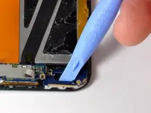 Осторожно вставьте лопатку между батареей и дисплеем. Под ней проходят кабели, поэтому медленно подденьте батарею, чтобы не повредить проводку.