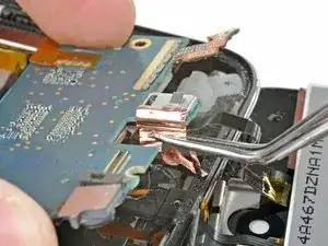 Используйте край инструмента для вскрытия iPod, чтобы начать отрывать виток медной ленты, обёрнутой вокруг разъёма в центре верхнего края логической платы.