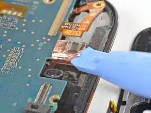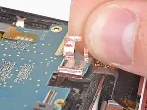Пока вы аккуратно приподнимаете логическую плату одной рукой, используйте инструмент для вскрытия iPod, чтобы приподнять логическую плату рядом с медной лентой в верхней кромке платы.