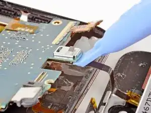 Если пластина всё ещё прикреплена к логической плате, повторно подогрейте область, чтобы ослабить клей, затем медленно отделите пластину от логической платы с помощью инструмента для вскрытия.