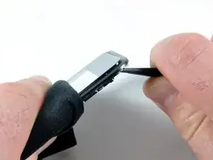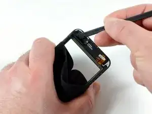 Вставьте маленький пластиковый инструмент для вскрытия в шов между пластиковой панелью дисплея и металлической задней панелью. Угловой край должен быть направлен в сторону металлической задней панели.