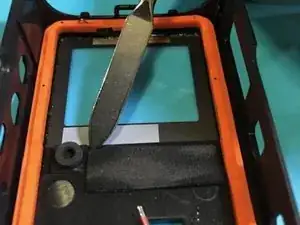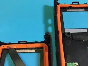 Медная контактная плата приклеена к пластиковой передней панели и должна быть расслаена с помощью чёрного пластикового инструмента. Продолжайте вставлять синие съёмники, чтобы равномерно распределять усилие при съёме платы. НЕЛЬЗЯ использовать металлический инструмент здесь.