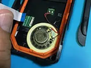 Подключите терминалы динамика. Провод с чёрной полосой подключается к отрицательному терминалу (справа на фото). Используйте небольшую бумажную ленту, чтобы аккуратно уложить провода. НА ФОТО НЕТ: подключите ленточный кабель. Проверьте звук и клавиатуру перед фиксацией лицевой панели на шасси.