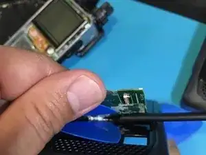 Пластиковый инструмент (виден справа) можно использовать, чтобы поддеть защёлку петли, которая удерживает конец ленточного кабеля в разъёме. Используйте ноготь, чтобы помочь пластиковому инструменту освободить защёлку петли, не прижимая кабель.