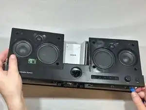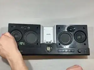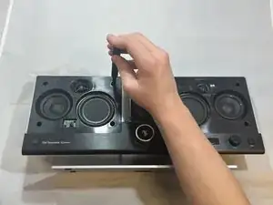 Осторожно подденьте крышки динамиков с боков, поднимая четыре угловые опоры, которые удерживают крышку на месте.