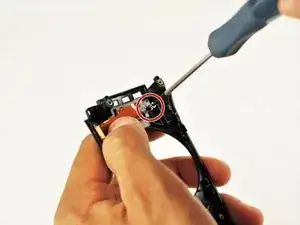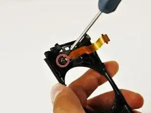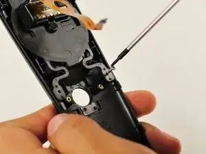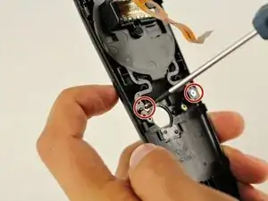 Используйте отвертку Torx T5, чтобы выкрутить два серебристых винта длиной 4,2 мм из задней пластиковой крышки кнопки меню.