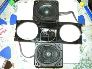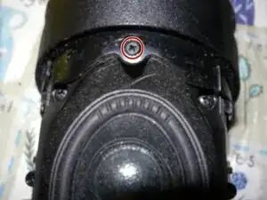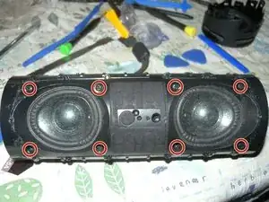 Снимите восемь винтов крестовой отвёрткой №1, которые крепят динамик. Также этим винтам крепятся пластиковые части передней крышки, как показано на третьем фото.