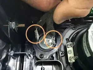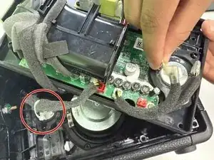 Найдите две пищалки. Одна расположена на задней крышке динамика, другая — внутри корпуса динамика, слева от основного динамика.