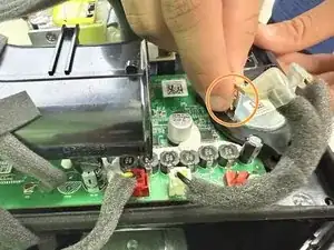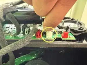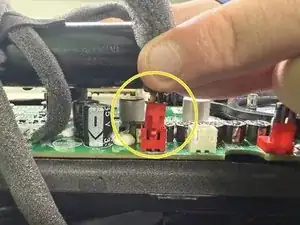 На другом конце этих двух разъёмов отсоедините красный разъём, подключённый к задней крышке динамика, нажав на защёлку и потянув вверх.