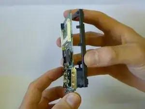 Выдвиньте или протолкните кейс батареи через прямоугольное отверстие. Материнская плата теперь должна отделиться от пластикового корпуса.