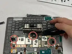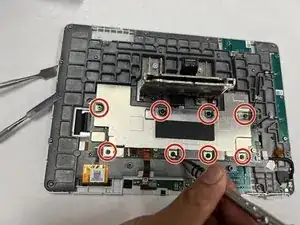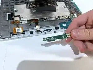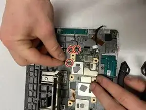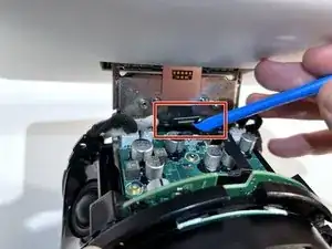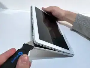 Плата приклеена, поэтому используйте лопатку, чтобы разъединить клей. Это может занять некоторое время; действуйте терпеливо, чтобы не повредить устройство.