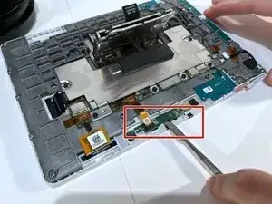 Используйте инструмент для вскрытия, чтобы поднять маленький фиксирующий язычок на разъёме ленточного кабеля, расположенном в центре открытой нижней части шейки дисплея.