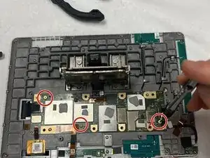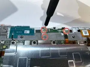 Используйте отвертку Torx T5, чтобы выкрутить два винта длиной 4 мм с кронштейна, закрывающего плату микрофона, и один винт длиной 4 мм, фиксирующий саму плату.