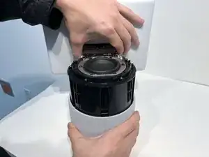 Установите устройство Echo в вертикальное положение, крепко удерживайте основание и используйте синюю лопатку, чтобы осторожно отжать крышку от сетчатого корпуса динамика.