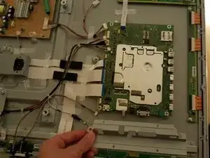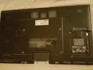 Согласно комментарию Дэйва Уотсона, удалив все винты с задней панели в нижней части телевизора, нужно также открутить и снять два модуля: Wi-Fi и Bluetooth. У модуля Bluetooth в верхней части есть защёлка, которую нужно нажать, чтобы извлечь его. Модуль Wi-Fi просто вынимается.