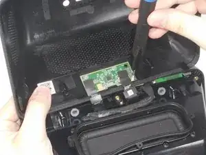 Ленточный кабель приклеен к корпусу динамика. Берегите его, чтобы не порвать при подъёме платы питания.