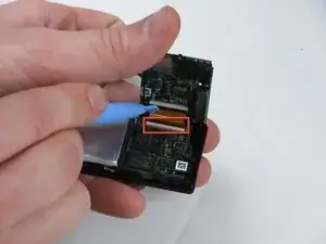 Отсоедините ленточный кабель с помощью инструмента для вскрытия Zune, поддев чёрную пластиковую защёлку вверх в месте подключения кабеля к плате памяти.