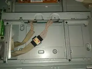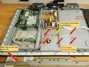Снимите металлическую деталь в верхней части, которая также перекрывает доступ к плате T-Con.
