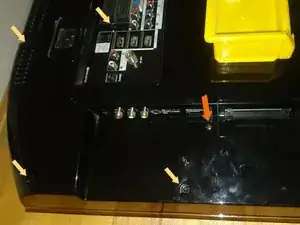 Ослабьте все винты, удерживающие заднюю крышку. Все они одного размера, кроме одного (он отмечен оранжевой стрелкой на фотографии). Будьте осторожны с четырьмя винтами в нижней центральной части — они держат подставку (основание).