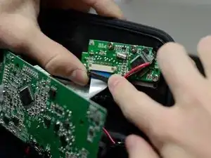 Снимите ленточный кабель, сначала извлекая коричневую вставку из разъёма на плате кнопок