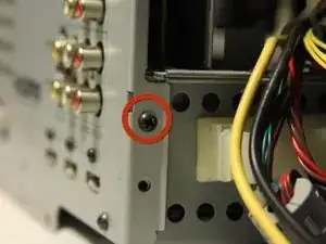 Удалите четыре винта Phillips #1 черного цвета длиной 10 мм с мелким резьбой, которые крепят защитный кожух к телевизору.