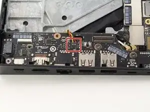 Рядом с пустым разъёмом, к которому были подключены чёрные провода (см. шаг 2), отсоедините пластиковый фиксатор от платы ввода/вывода, отодвинув фиксатор от разъёма пальцем.