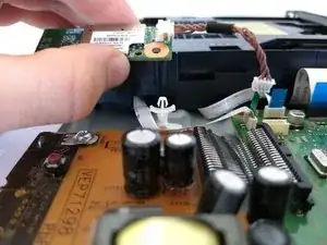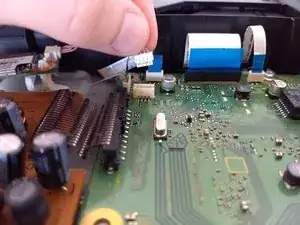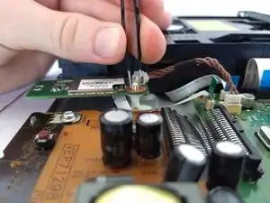Найдите красновато-коричневый кабель. Отсоедините его от зелёной платы, потянув вверх.