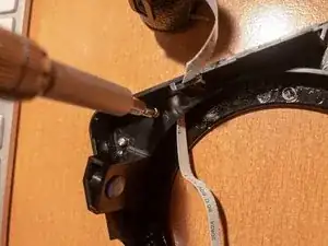 Выкрутите два маленьких винта, чтобы освободить пластиковую деталь, удерживающую плоский кабель на корпусе.