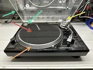 Поставьте проигрыватель перед собой, откройте пылезащитный кожух и снимите следующее: