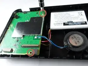 Удалите два винта длиной 0,5 см с помощью отвертки Torx T4, которые крепят материнскую плату к задней крышке GPS-устройства.