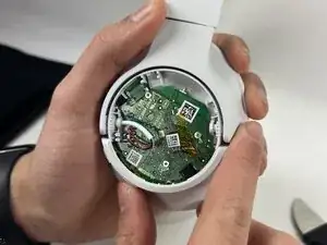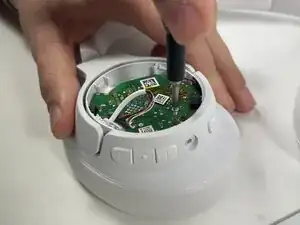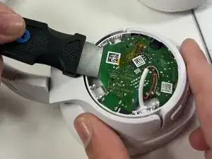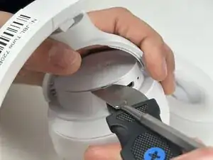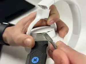 Используйте инструмент Jimmy, чтобы снять заднюю крышку левой чашки, чтобы открыть батарею. Отключите батарею, аккуратно потянув за красные, белые и черные провода, вытаскивая их из гнезда.